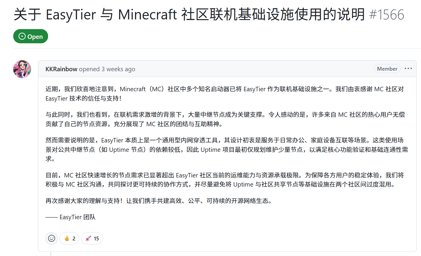 编辑近期,大量使用EasyTier的网友发现EasyTier官网的控制台入口不见了,即使以前收藏过控制台地址登录地址,在访问的时候既不能登录也无法注册。经过了解,发现在Github官方已经发布了原因,如下图: