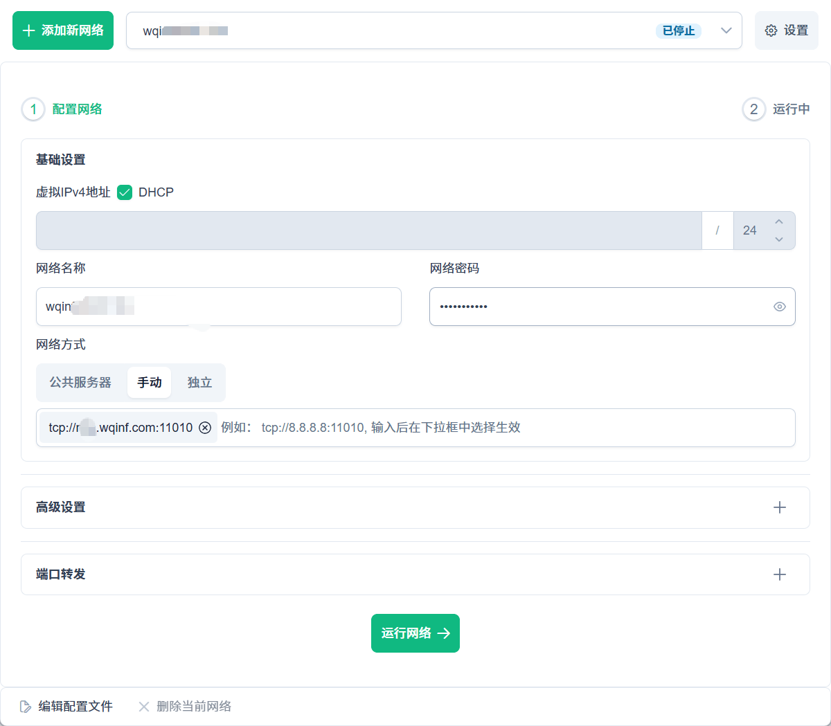 我们最常使用的是Windows的电脑办公,那么先下载Windows的客户端并安装(安卓手机客户端也是一样的方法),下载地址:https://easytier.cn/guide/download.html,然后点击左上角的“添加新网络”,这里要输入的内容包括三部分,分别是网络名称、网络密码,还有网络方式,其中前两者就是前面代码里面让你自己记住就行的账号和密码,网络方式选择手动,输入tcp://你自己解析好的域名:11010。如下图: