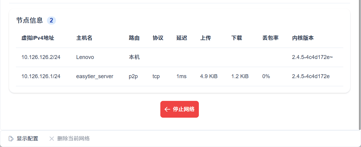 因为不通过第三方中继节点(官方公共中继节点也算),所以这里只显示完成组网的两台设备,其中上面的Lenovo是我在外面的电脑,easytier_server是部署在家中飞牛NAS的Docker的服务。