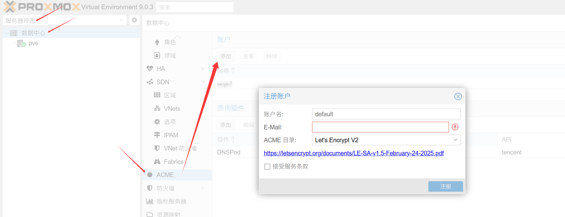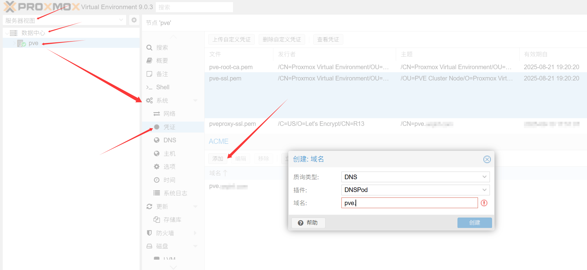 通过域名访问简单,买个域名配置下解析并配置端口转发即可,SSL 证书本身也很简单,就是免费证书有效期都不长,经常要去做重复的操作很麻烦。不过可喜的是,PVE 内置了一个叫做 ACME 的模块,通过它我们可以一键申请并部署新的 SSL 证书。