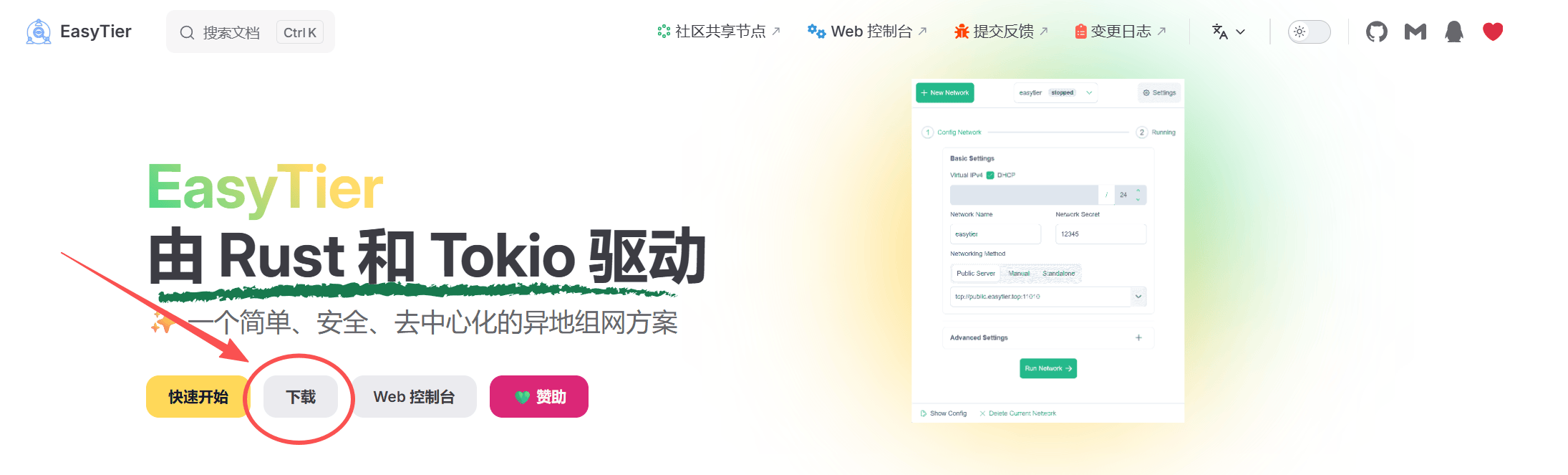 官网首页(https://easytier.cn/)点击“下载”按钮,或者直接访问下载地址:https://easytier.cn/guide/download.html。