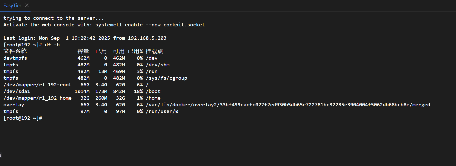 首先先登录服务器(建议使用root账户),然后执行”df -h”,查看服务器那个位置的空间最大,例如服务器部署的时候我是采用默认的分区方式: